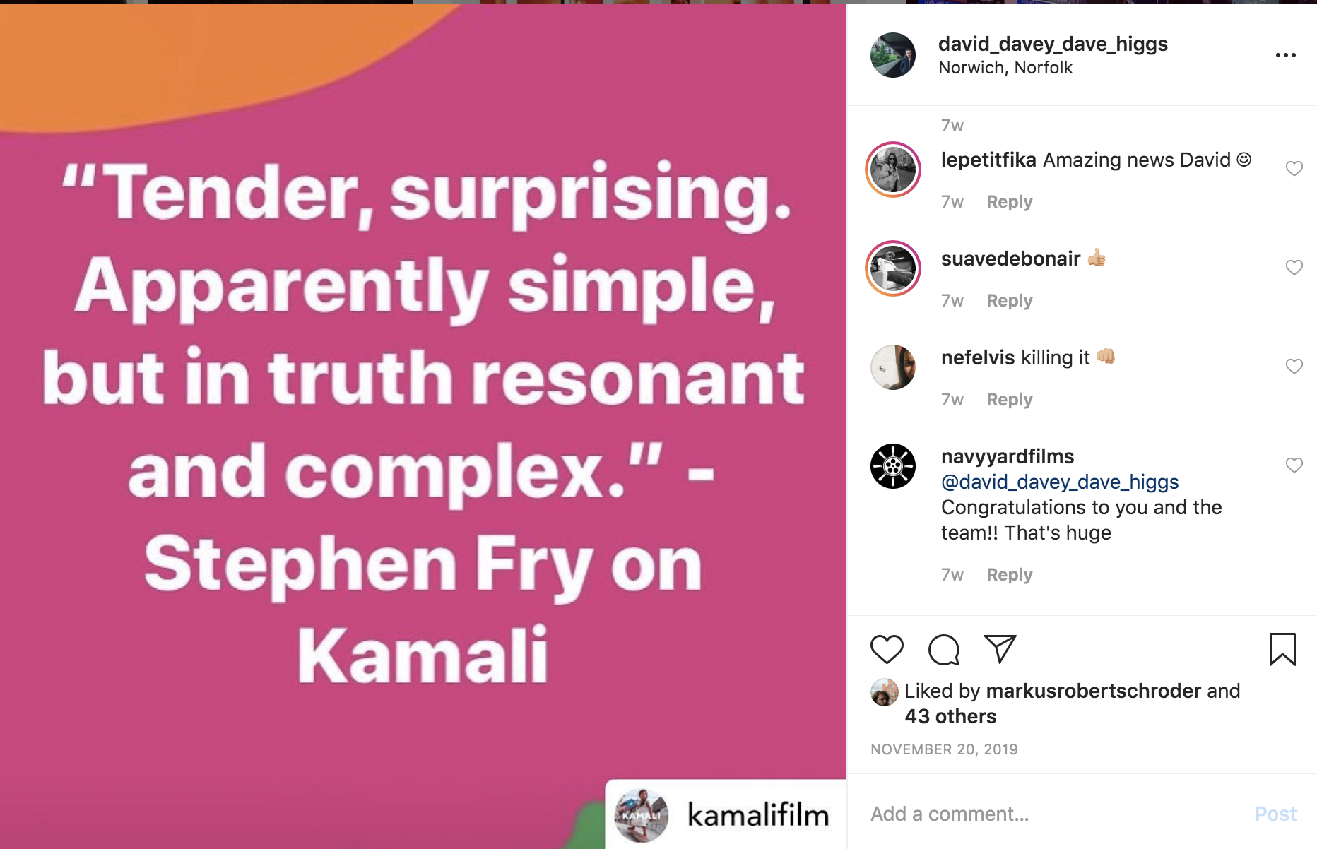 Kind words from Stephen Fry, who was on the jury and chose Kamali as the winning film at Norwich Film Festival!